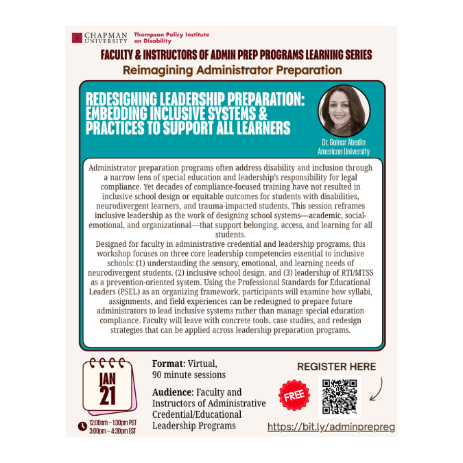 Presented by Dr. Golnar Abedin of American University, this ninety-minute session introduces faculty to strategies and resources designed to strengthen leadership programs and instructional practices. Participants will explore practical ways to embed inclusive systems, policies, and practices into Administrative Credential and Educational Leadership coursework, helping future principals create school environments that promote equity, engagement, and high expectations for all learners.